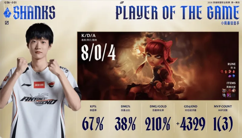 Shanks安妮打出8/0/4战绩,拿到AL对阵IG第四局比赛MVP